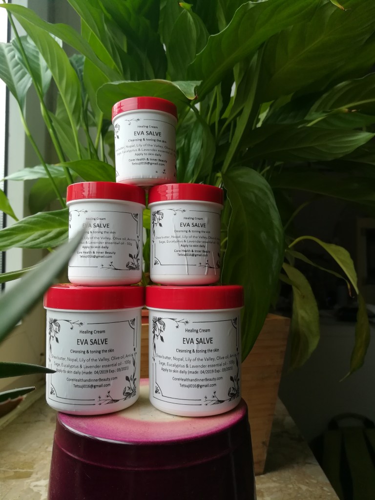 Healing salve is a copy of Dr Sebi Eva Salve with the following ingredients: shea butter, lily of the valley, nopal, olive oil, arnica, sage, eucalyptus, lavender & eucalyptus & lavender essential oil and vitamin E.