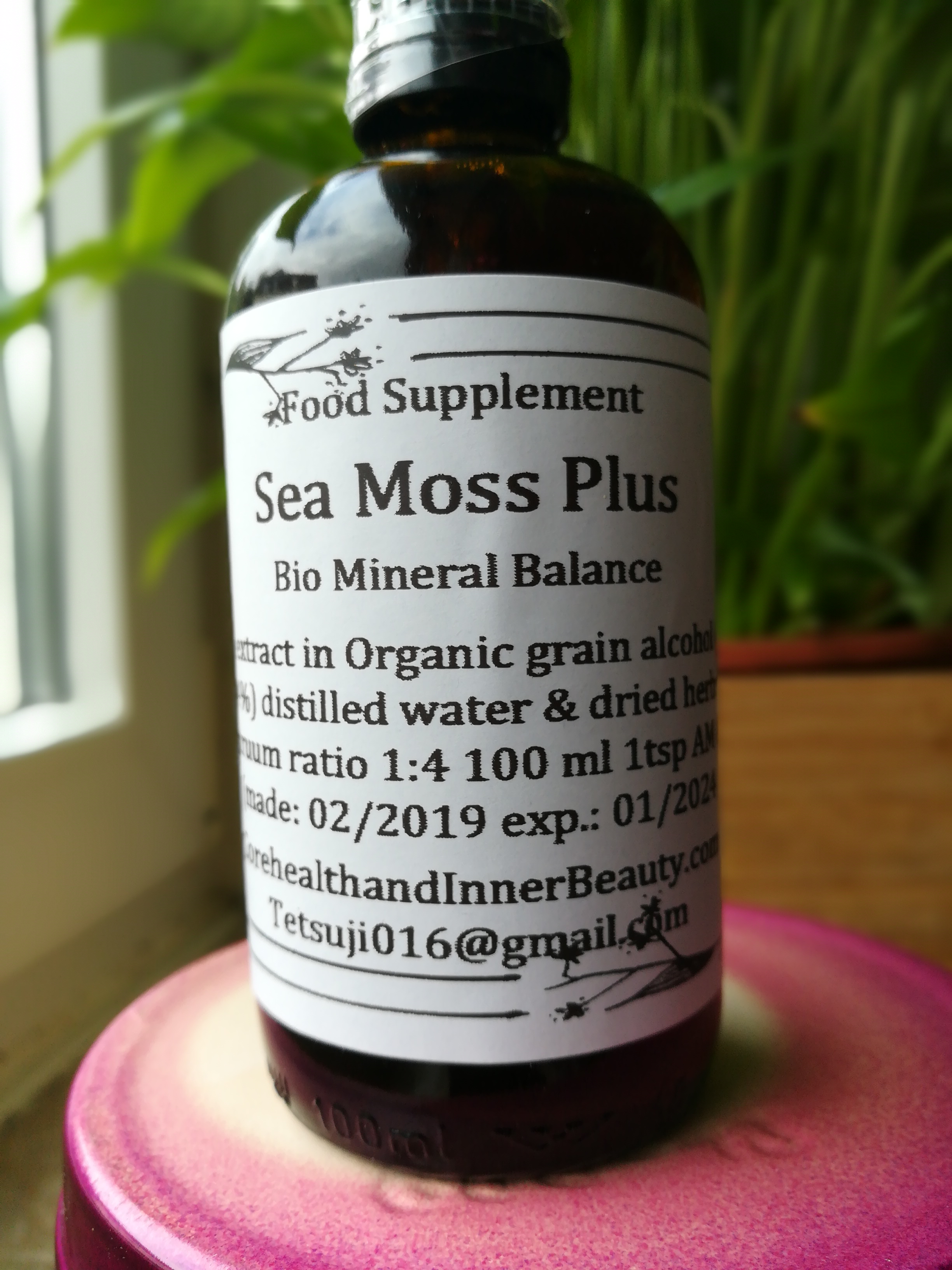 Ingredients: Seamoss & Bladderwrack as liquid extract in 40%-54% distilled sugar cane alcohol and dried herbs/menstruum ratio 1:4 (100ml & 250ml) made February 2019 with expiry date January 2024.