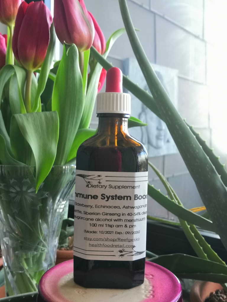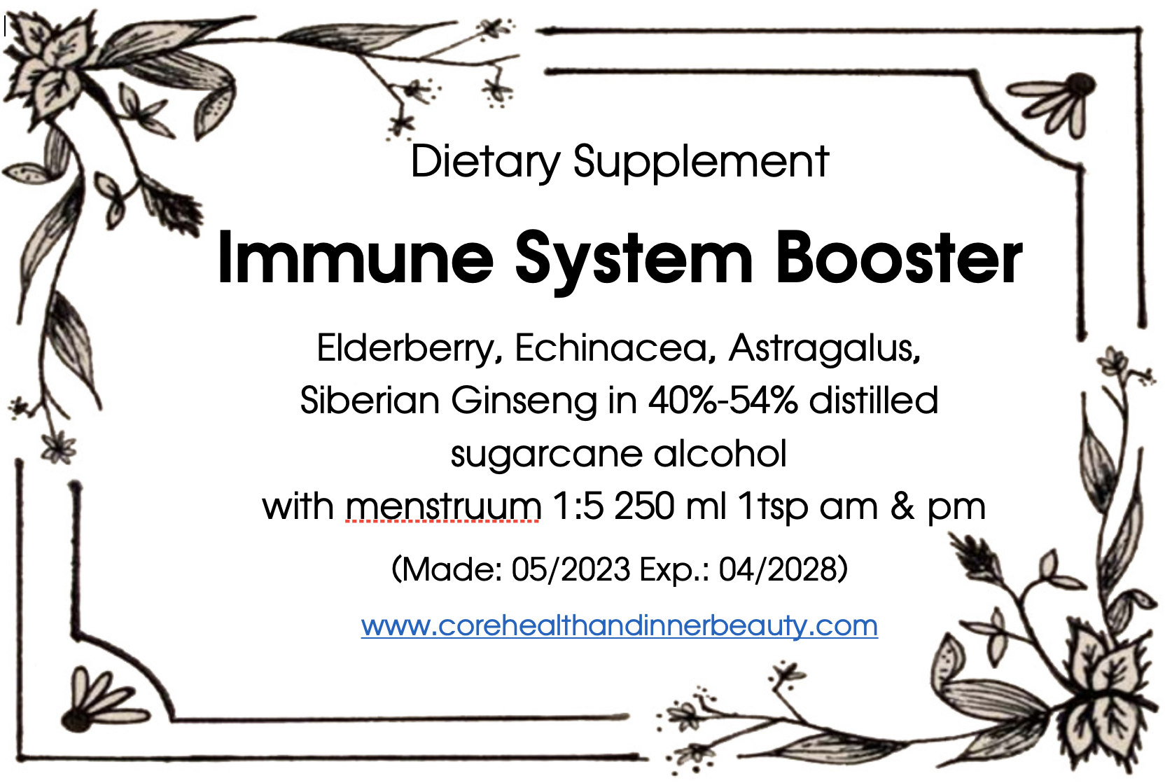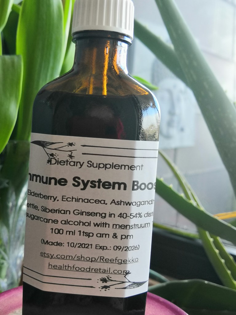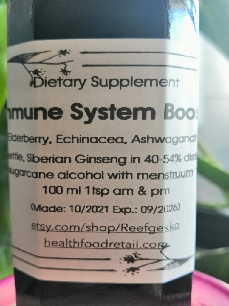 Elderberry (fruit & flower), Echinacea (whole plant), Astragalus & Siberian ginseng in 40%-54% distilled sugarcane alcohol and dried herbs/menstruum ratio 1:5 (50ml, 100ml & 250ml) Made November 2024 with expiry date October 2029.